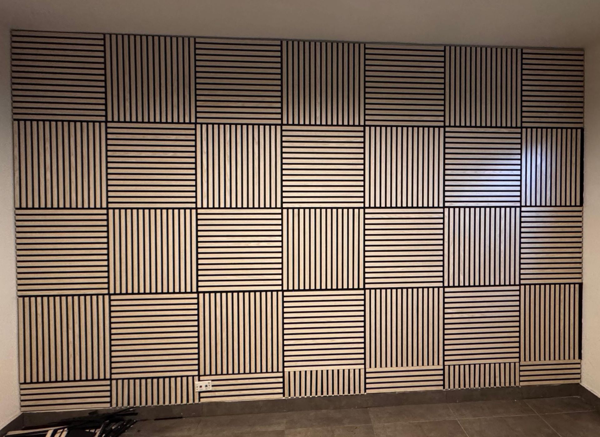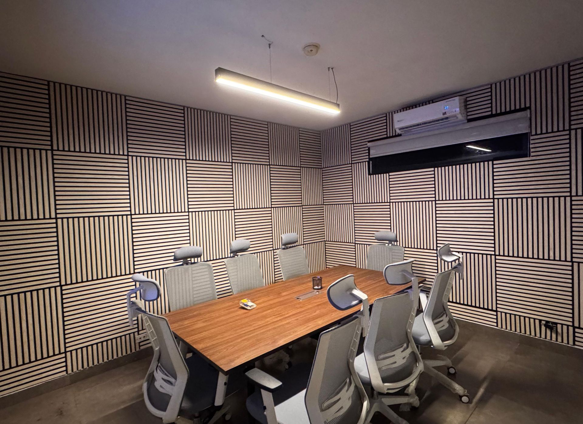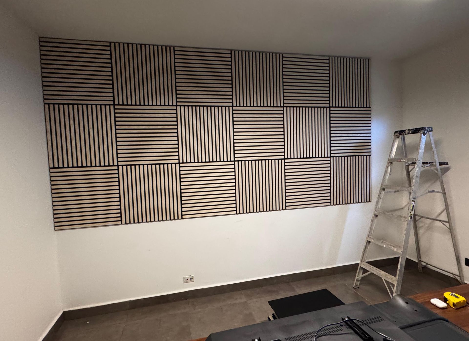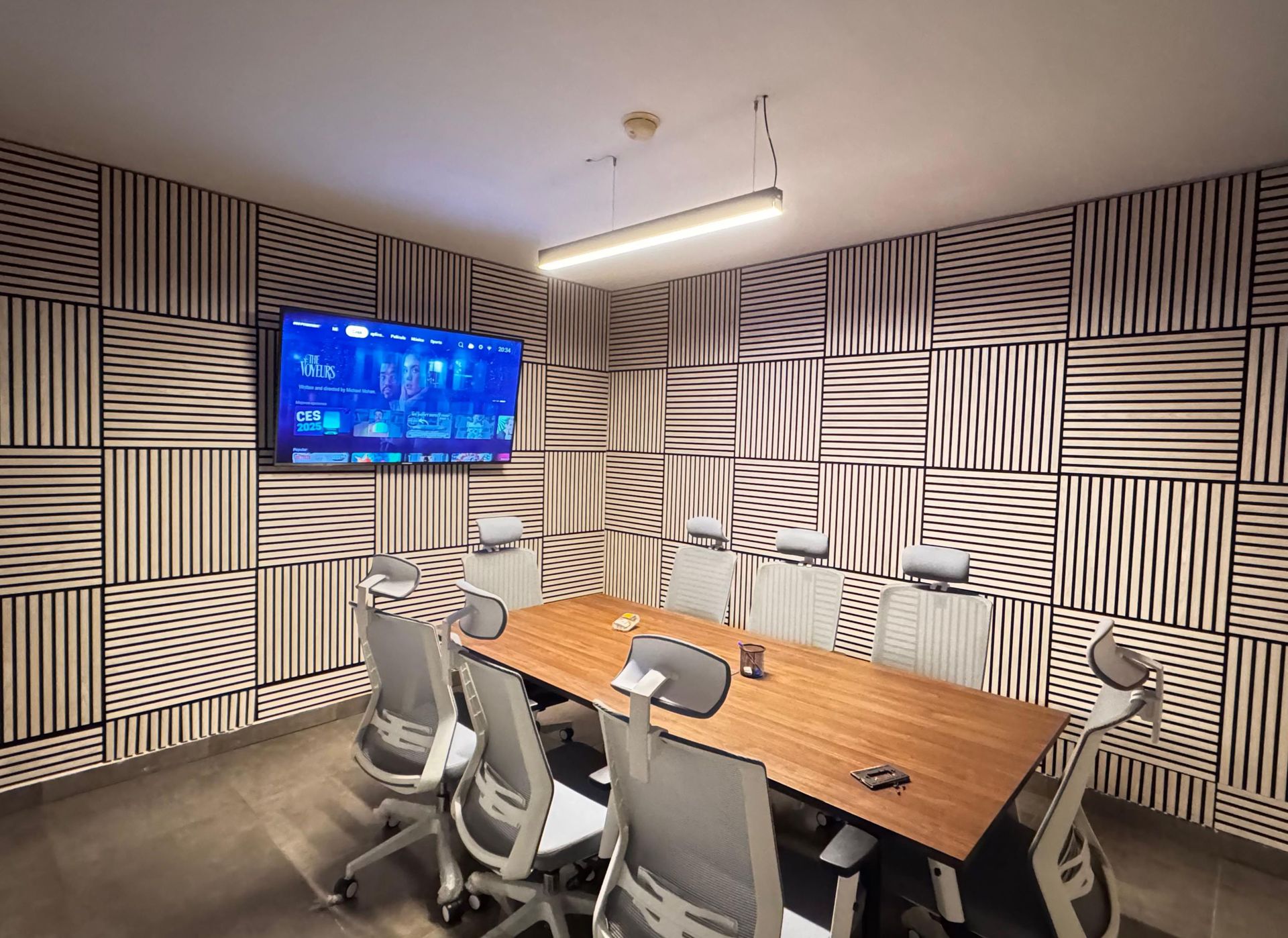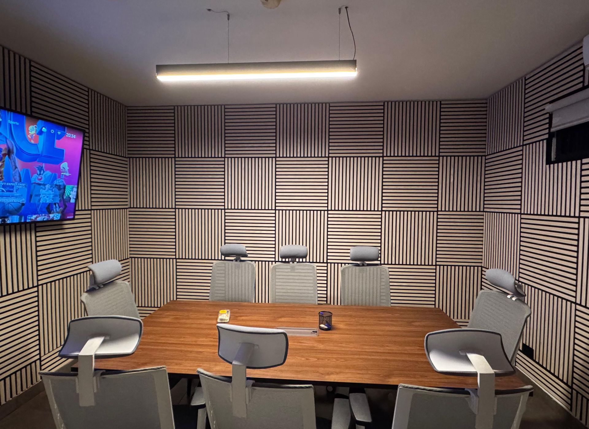 Proyecto de acondicionamiento acústico en una sala de reuniones corporativa en Ciudad de Panamá, diseñado para mejorar significativamente la calidad sonora del espacio y elevar su propuesta estética. Se instalaron paneles acústicos modulares de 60x60 cm, distribuidos estratégicamente en paredes para optimizar la absorción del sonido y reducir la reverberación, logrando un ambiente más cómodo para reuniones, videollamadas y presentaciones. El diseño combina funcionalidad y arquitectura interior, creando un patrón visual dinámico que aporta identidad al espacio, sin sacrificar desempeño técnico.